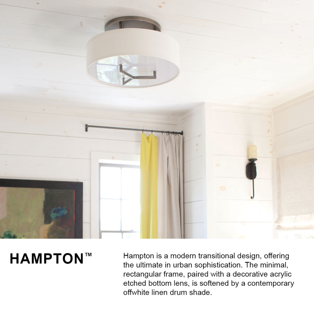 Hampton is a modern transitional design, offering the ultimate in urban sophistication. The minimal, rectangular frame is softened by a contemporary off-white linen drum shade.